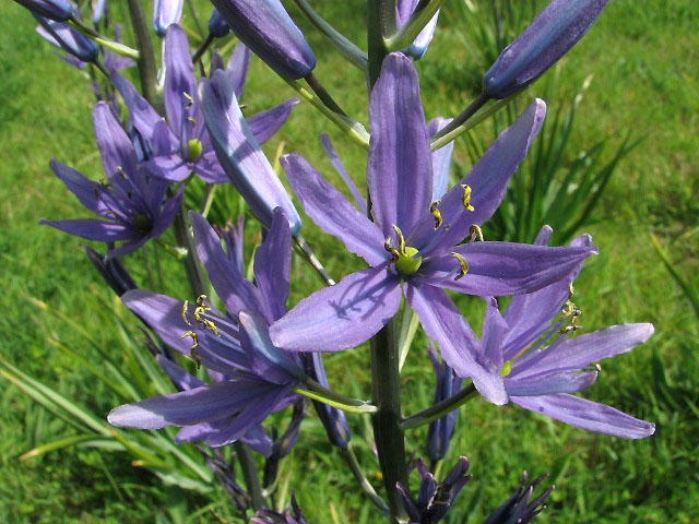 Habitat/Uses: Camas plants are relatively common in fragile Garry oak meadows. The meadow in Yellow Point Park that faces Yellow Point Road is a typical Garry oak meadow; camas flowers are found there in abundance in the spring. Camas are also found growing on rocky outcrops, in coastal mountain forests, and in marshy meadows inland. They grow in full sun to part shade in fertile, moist, well-drained soils, tolerating drier conditions as the plants become dormant in the summer. Plants are easy to grow from seed, and are deer- and rodent-resistant.