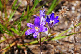 Descripton: Blooming in late June/early July, these native perennial six-petalled lavender-blue, violet, or rose upright bell-shaped flowers grow in a loose umbel. They arise on an erect stem from 1-3 grass-like basal linear leaves, ~ 2 mm wide. At the centre of the flower are white to purple hornlike staminodes (sterile stamens) that lean toward the fertile stamens. It can reach a height of 30 cm in some habitats, but is usually shorter in the Yellow Point area.