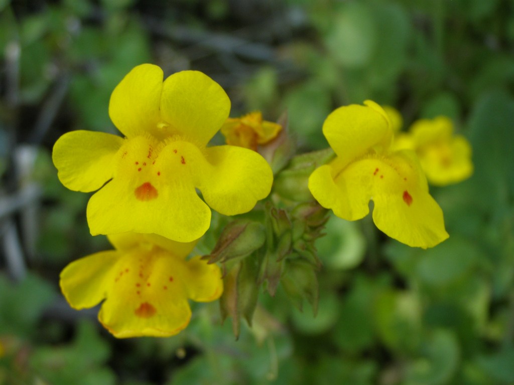 Description: The dainty, intensely yellow monkey flower is an herbaceous perennial that blooms in Yellow Point in early to late spring, and continues into early summer. Blossoms, 1-4 cm in length, form clusters at the tops of stems, which can reach 10cm. Each flower is a bright yellow funnel of five fused petals – two at the top, three at the bottom. The throat of the flower has bright maroon spots and can be quite hairy. Oppositely arranged oval leaves, 1-10cm in length, are generally yellowish-green. Margins are marked with large irregular teeth.