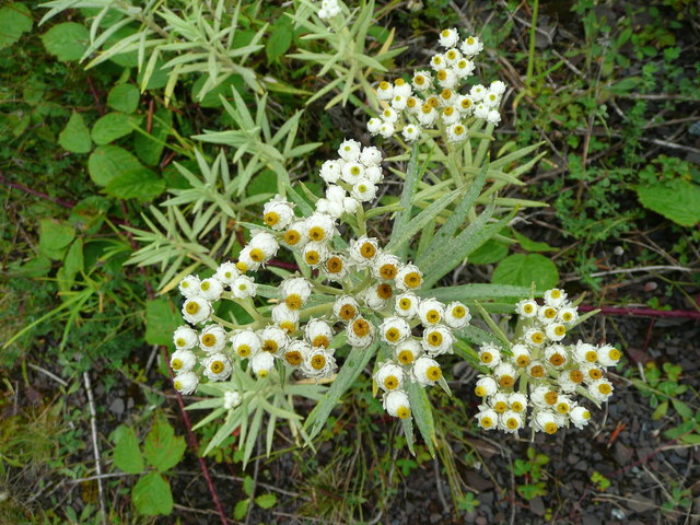 Description: Emerging in late June or early July in Yellow Point, the individual cottony stems of the herbaceous perennial pearly everlasting grow 30-90 cm in height, often in clumps. Flowers are globular, long-enduring, white, dry bracts with yellow centres, resembling fried eggs, although younger flowers are reminiscent of small pearls. Flowers are often slightly musky smelling. Leaves are long and slender, arranged alternately, with green surfaces and white, woolly undersides that match the stems. The hairy stems and leaves are an adaptation to reduce water loss and overheating.