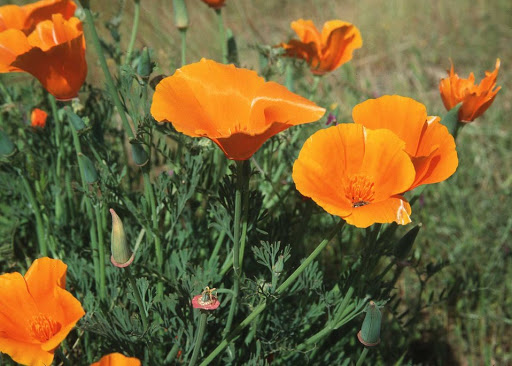 Habitat/Uses: Drought-tolerant and easy to grow in sandy, poor-to-average, well-drained soil, seeds germinate with rain and warmth in the spring. They can be found at low to mid-elevations. In our climate, poppies can survive several years via a fleshy taproot. Alternatively, when happy in their habitat, self-seeding is a common phenomenon. In landscaping, they can be used in container gardens, mixed beds, rock gardens, and xeriscapes. Deadheading spent flowers can encourage new blooms, but collecting seeds from seed pods affords spread of more beautiful colour in the garden. After the risk of frost is past, press the seeds lightly into the soil and water gently. Blue-green foliage appears after approximately two weeks, followed by the spectacular orange flowers. Deer and rabbit resistant (possibly because all parts of the plant are poisonous to mammals), these poppies attract bees, butterflies, and hummingbirds.