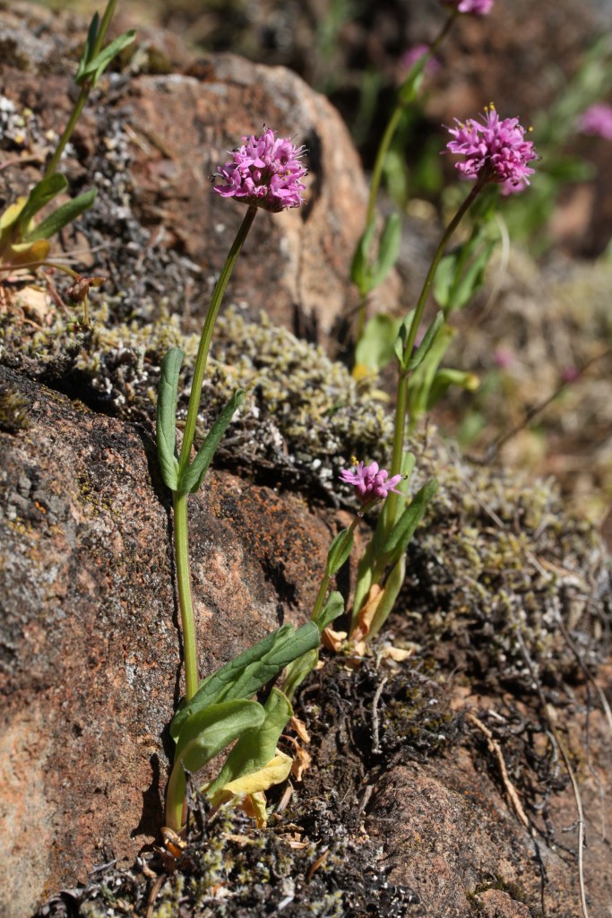 Description: A self-seeding annual herb appearing in early spring and lasting into early July, seablush flowers appear as swaths of small pink pom-poms that brighten often overcast and rainy spring days. Slender stems bear widely oval leaves, with rounded or pointed tips. Plants can reach a height of 60cm in some locales, but in Yellow Point the tallest plant would likely be in the range of 15-20cm. The flower head bears many tubular flowers, each with an upper and lower lobed lip. Three stamens tipped with purple anthers carry yellow pollen.