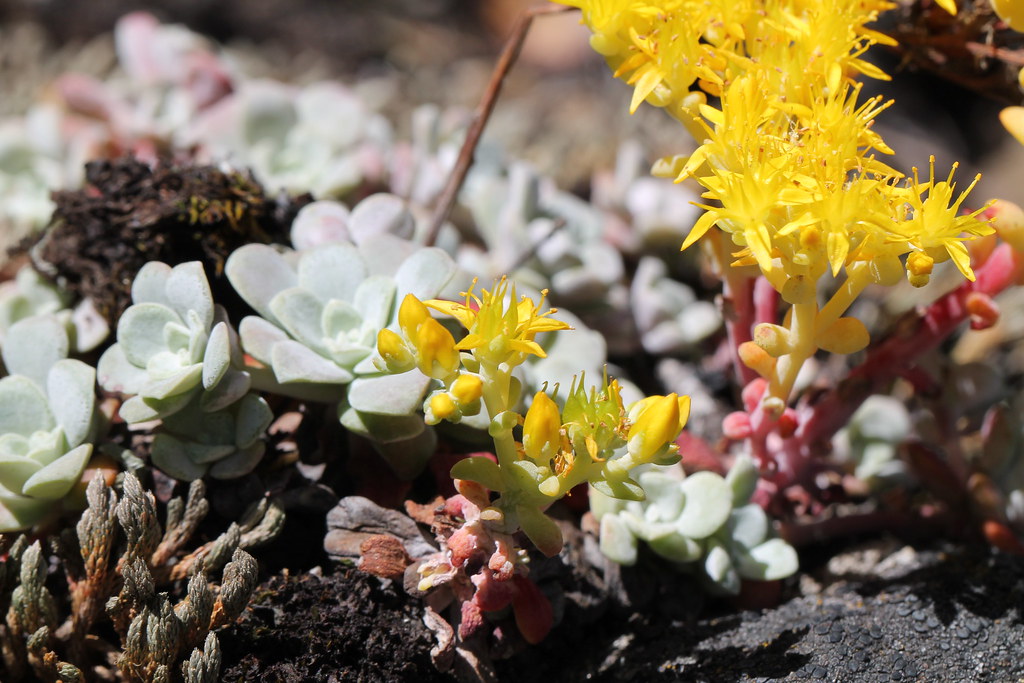 Description: Found on cliffs and sunny rock faces throughout Yellow Point, this perennial plant is rumoured to have been the source of Yellow Point’s name. Flowering from May to July, the plant appears typically succulent, with grey-green to dark-red plump rosettes (2-4 cm in diameter) consisting of approximately 15 spoon-shaped leaves. Rosettes give rise to a short (8-10 cm), erect inflorescence composed of many small, bright yellow, starry flowers containing 10 stamens and 5 pistils.