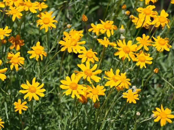 Description: Also known as Oregon Sunshine, the woolly sunflower is not a ‘real’ sunflower, but a fibrous-rooted perennial herb. The intensely yellow, daisy-like flowers, up to 5 cm in diameter, bloom from May to August. The flower is actually a flower head of numerous florets. Looking closely, one sees that the outside flowers have 1-2 cm oval petals, framing numerous inner florets. The silver-grey stems, bearing multiple silvery leaves, shoot upward from the ‘woolly’ base foliage. A mature, robust plant can reach 60 cm in height, but wild plants most often only reach a maximum height of far less.