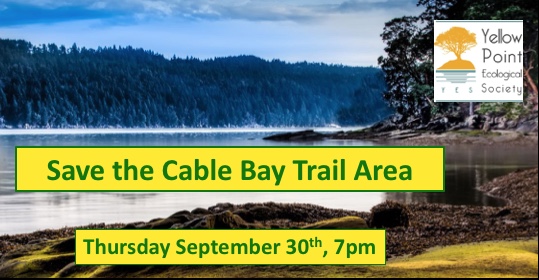 More than 17,000 people have signed the petition urging protection for the lands around the Cable Bay Trail and Joan Park. So what’s happening? Jain Alcock-White, Guy Dauncey and Laura Augustine will bring you up to date, and explain the complicated story around land ownership, the City of Nanaimo and the Regional District of Nanaimo. Hosted by the Yellow Point Ecological Society. We recognize that Thursday is the National Day for Truth and Reconciliation, and we will open our meeting with a focus on this. To register: https://www.eventbrite.ca/e/save-the-cable-bay-trail-area-tickets-177516024207