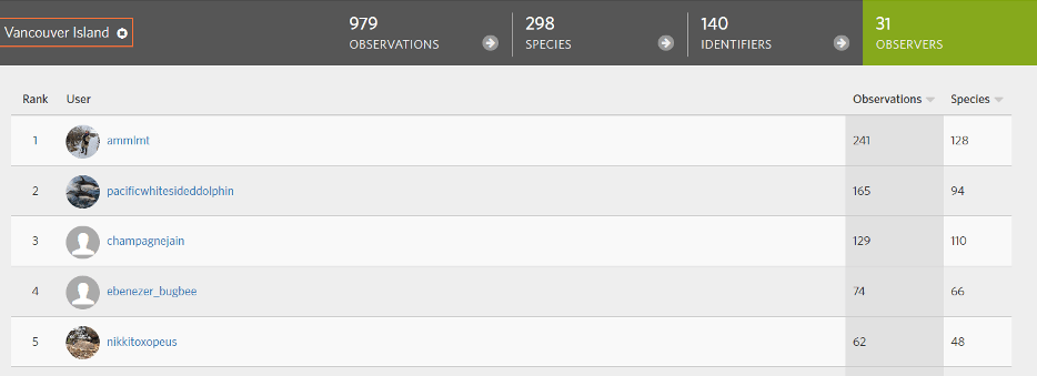 We clocked up a similar number of species as previous years, with fewer observers. We had 298 research grade species as shown below, thanks to the quality of the observations and the support of the wider iNaturalist community helping ID the entries.