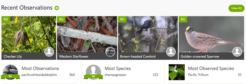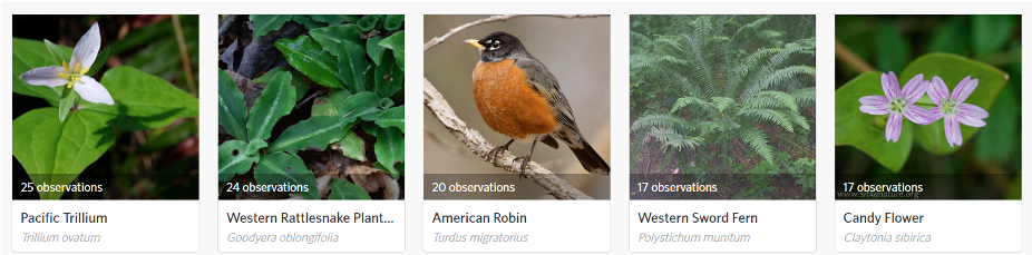 Pacific Trillium (Trillium ovatum) was the most observed and by the most people. Western Rattlesnake Plantain (Goodyera oblongifolia) was spotted multiple times by a few people. The Great Blue Heron (Ardea herodias) was the top observed species last year and no one recorded it this year.